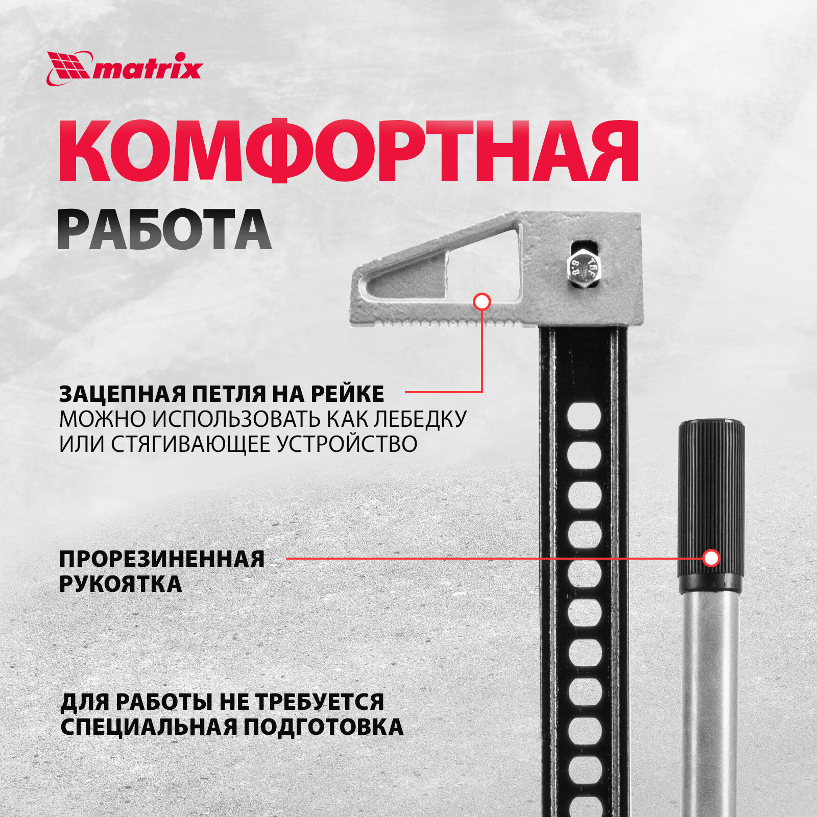 Лучшие цены. Реечный домкрат Matrix High Jack 505195 незаменим для автолюбителей при необходимости ремонта автомобиля. С его помощью можно поднимать внедорожники и грузовики весом до 3 т на высоту 135-1315 мм. Несущая рейка дополнена зацепной петлей, поэтому домкрат также можно использовать как ручную лебедку или стягивающее устройство. ПреимуществаНадежность и прочность домкрата обеспечивают качественные материалы: сталь и чугун. Магазины в вашем городе.