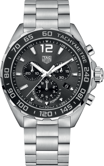 Лучшие цены. Tag Heuer Formula 1 Chronograph Мужской хронограф, окошко даты в положении 4 часа, керамический безель с тахиметрической шкалой, вращающийся в одном направлении, завинчивающаяся заводная коронка, завинчивающаяся задняя крышка. Счетчик 1/10 секунды и часовой счетчик хронографа в положении «6 часов», счетчик минут в положении «9 часов» и секундный счетчик в положении «3 часа. Магазины в вашем городе.