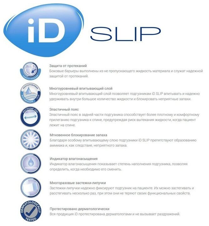 Лучшие цены. Многоуровневый впитывающий слой позволяет подгузникам iD SLIP надёжно удерживать внутри большое количество жидкости, а также блокировать неприятные запахи. Благодаря анатомической форме подгузника, манжетам в области ног, эластичному поясу на спине и многоразовым застёжкам-липучкам, которые надёжно фиксируют подгузник, изделие отлично прилегает к телу, гарантирует защиту от протеканий и максимальный комфорт. Индикатор влагонасыщения показывает степень наполнения подгузника. Магазины в вашем городе.