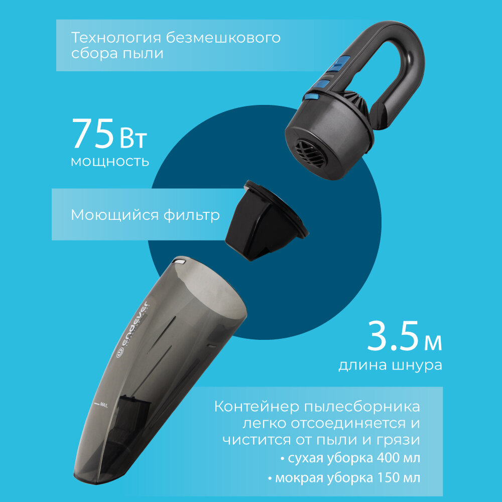 Лучшие цены. Мощный автомобильный пылесос ENDEVER VC-291 Быстро навести порядок в автомобиле, а заодно сэкономить на чистке салона вам поможет компактный, но мощный автомобильный пылесос ENDEVER VC-291. Созданный по технологии безмешкового сбора пыли, пылесос имеет особую конструкцию фильтра, увеличивающую его рабочую поверхность и воздухопроницаемость, а высокая плотность фильтрующего материала позволяет улавливать даже самые мелкие частицы. Сам фильтр можно промывать водой. Магазины в вашем городе.