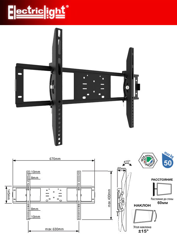 Кронштейн для телевизора Electriclight КБ-01-68 с наклоном до 50кг 37..75 дюймов VESA до 600x400мм - чёрный