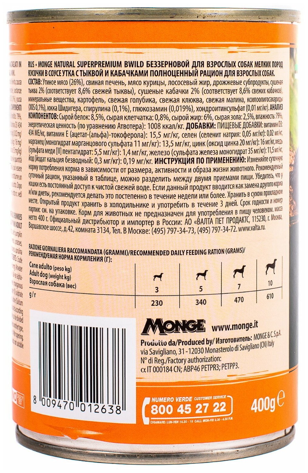 Влажный корм для собак Monge BWILD Feed the Instinct, беззерновой, утка, с тыквой, с цукини 2 шт. х 400 г (для мелких пород)