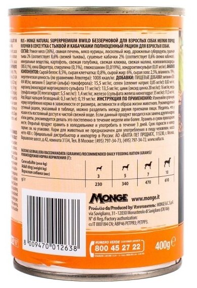 Влажный корм для собак Monge BWILD Feed the Instinct, беззерновой, утка, с тыквой, с цукини 12 шт. х 400 г (для мелких пород)