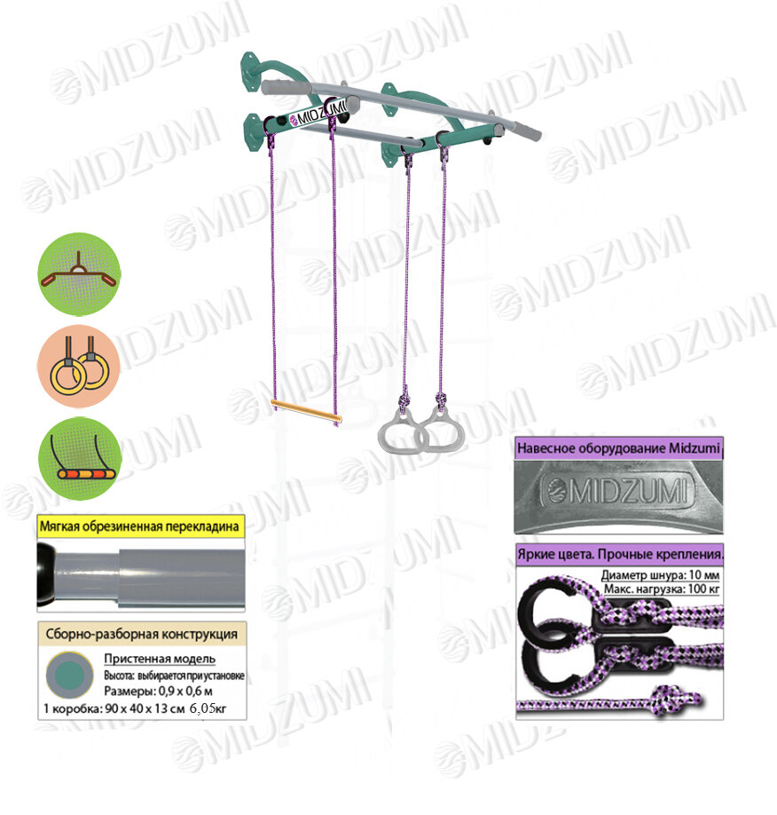 Турник Midzumi "Mun", гимнастические кольца и трапеция, нагрузка до 100кг