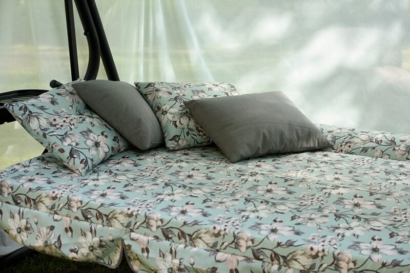 Качели садовые Olsa Турин Премиум FLOWER, каркас черный муар, ткань сер цветы
