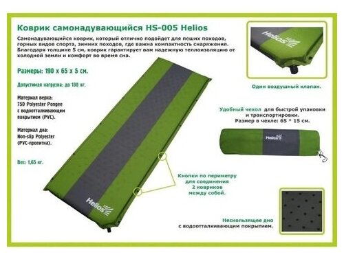 Лучшие цены. Самонадувающийся коврик Helios HS-005 отлично подходит для всех видов туризма: как для пешего, так и автомобильного. Коврик позволяет комфортно отдыхать на земле, скрадывая все мелкие неровности (шишки, корни, камни), и изолируя от холода, чему в немалой степени способствует его толщина - 5 сантиметров. Коврик не требует использования насоса или компрессора – нужно просто открыть клапан, расправить коврик, и он самостоятельно наполнится воздухом. Магазины в вашем городе.