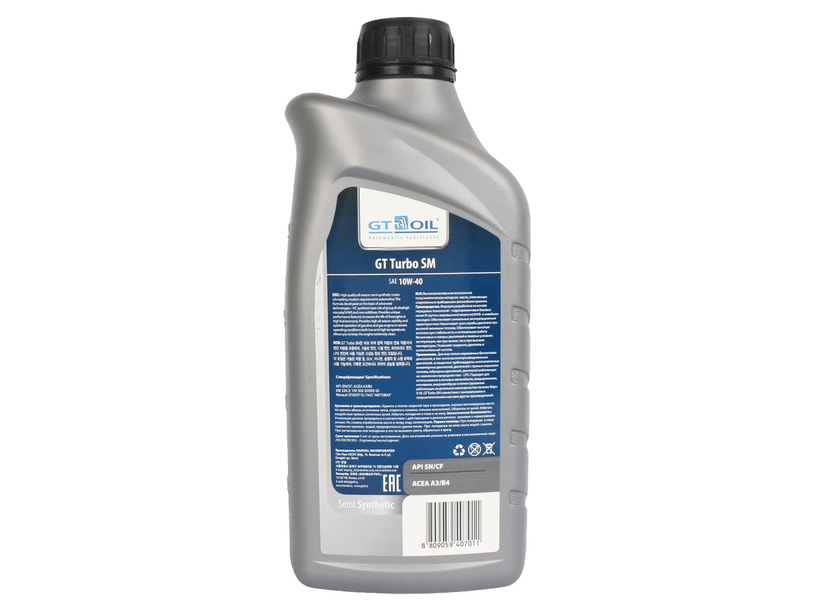 Масло моторное полусинтетич всесезонное GT Turbo SM SAE 10W-40 API SM SN CF 1Л 8809059407011