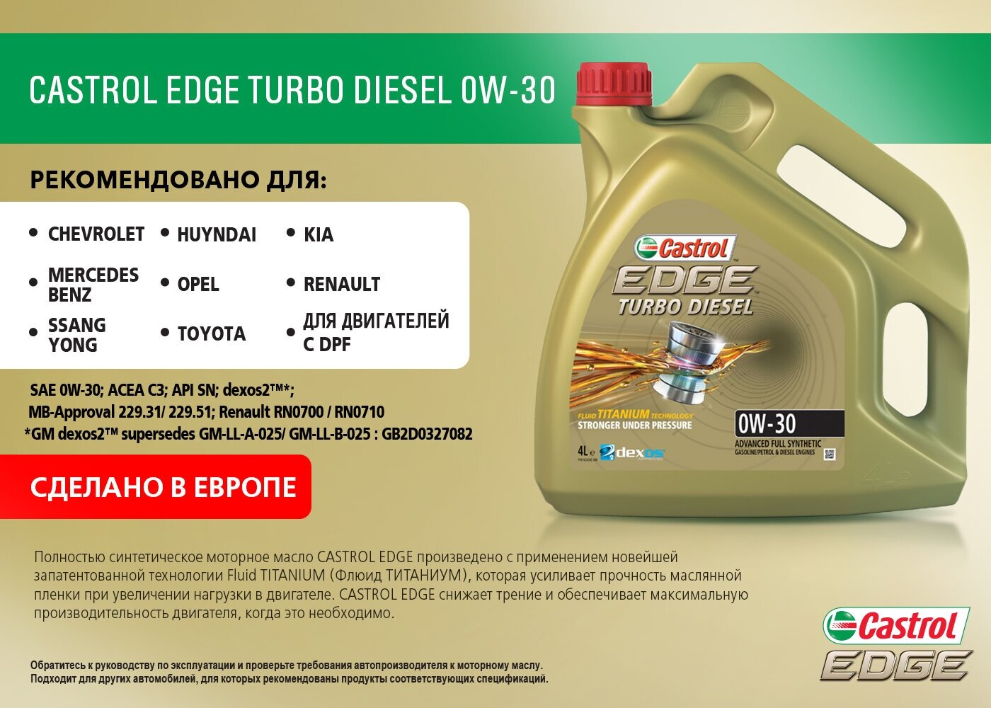 Лучшие цены. Моторное масло Castrol Turbo Diesel EDGE 0W-30 C3 произведено с использованием новейшей технологии, придающей масляной плёнке дополнительную силу и прочность. На протяжении всего межсервисного интервала обеспечиваются высокая экономия топлива и эффективная защита от износа. Магазины в вашем городе.