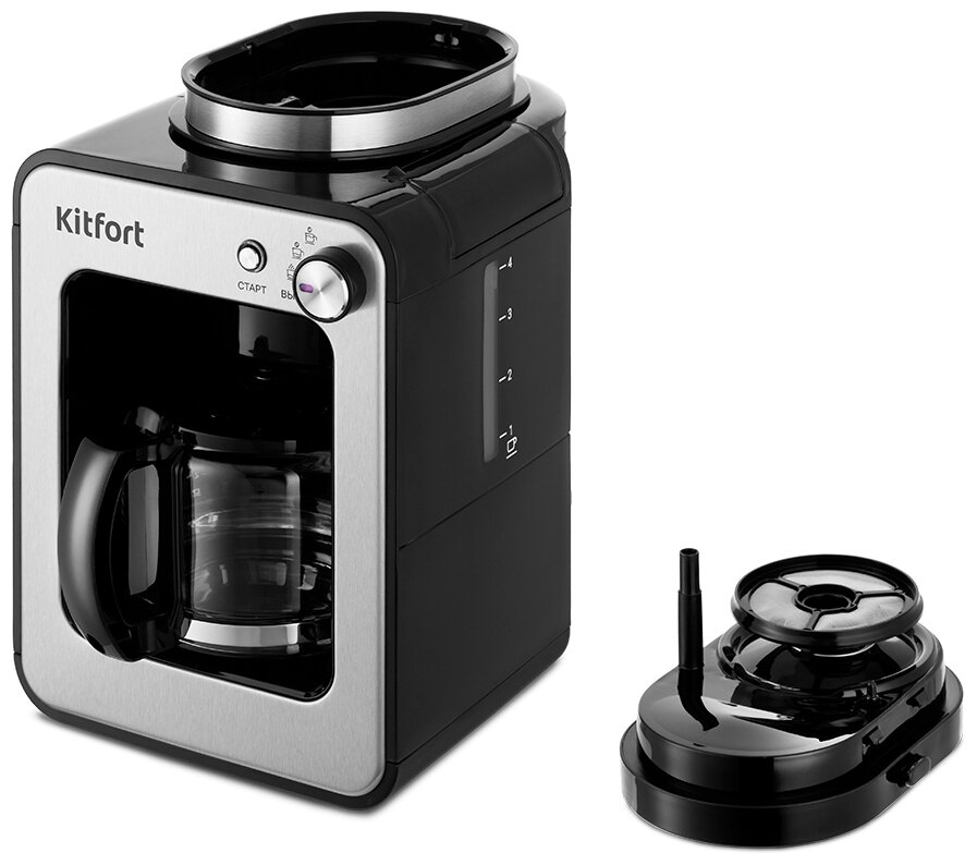 Лучшие цены. Небольшая капельная кофеварка Kitfort КТ-777 со встроенной кофемолкой готовит вкусный и ароматный кофе. Встроенная кофемолка автоматически измельчит кофейные зёрна и засыплет молотый кофе в фильтр, а затем заварит его специально для вас. Пользоваться кофеваркой просто! Регулятором вы можете выбрать нужный вам режим, а затем запустить приготовление. Загорится индикатор работы, который встроен в кнопку. Звуковые сигналы известят вас об окончании приготовления напитка и окончании подогрева. Магазины в вашем городе.