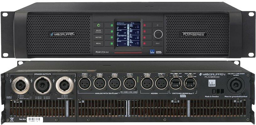Лучшие цены. Lab.gruppen PLM20K44/SP усилитель с DSP Lake, 4 входа > 4 выхода. Мощность (на канал): 4400Вт•2Ω, 5000Вт•2,67Ω, 4400Вт•4Ω, 2300Вт•8Ω, 1150Вт•16Ω. Входы: 4 аналог XLR, 4 AES (2 пары), Dante (8 входов/8 выходов). Подключение: Speakon NL8+2xNL4. Высота 2U. Магазины в вашем городе.