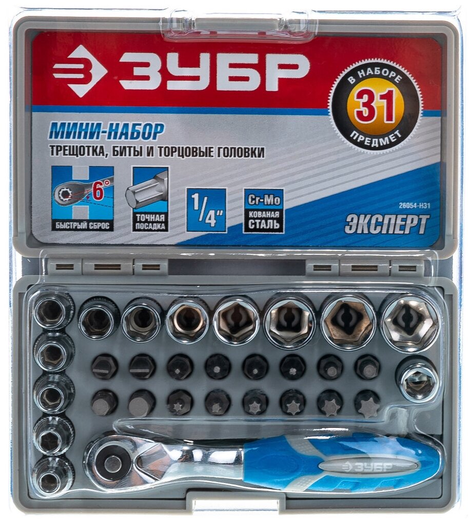 ЗУБР 31 шт., Cr-Mo, набор: трещотка, биты и торцовые головки 26054-H31 Эксперт