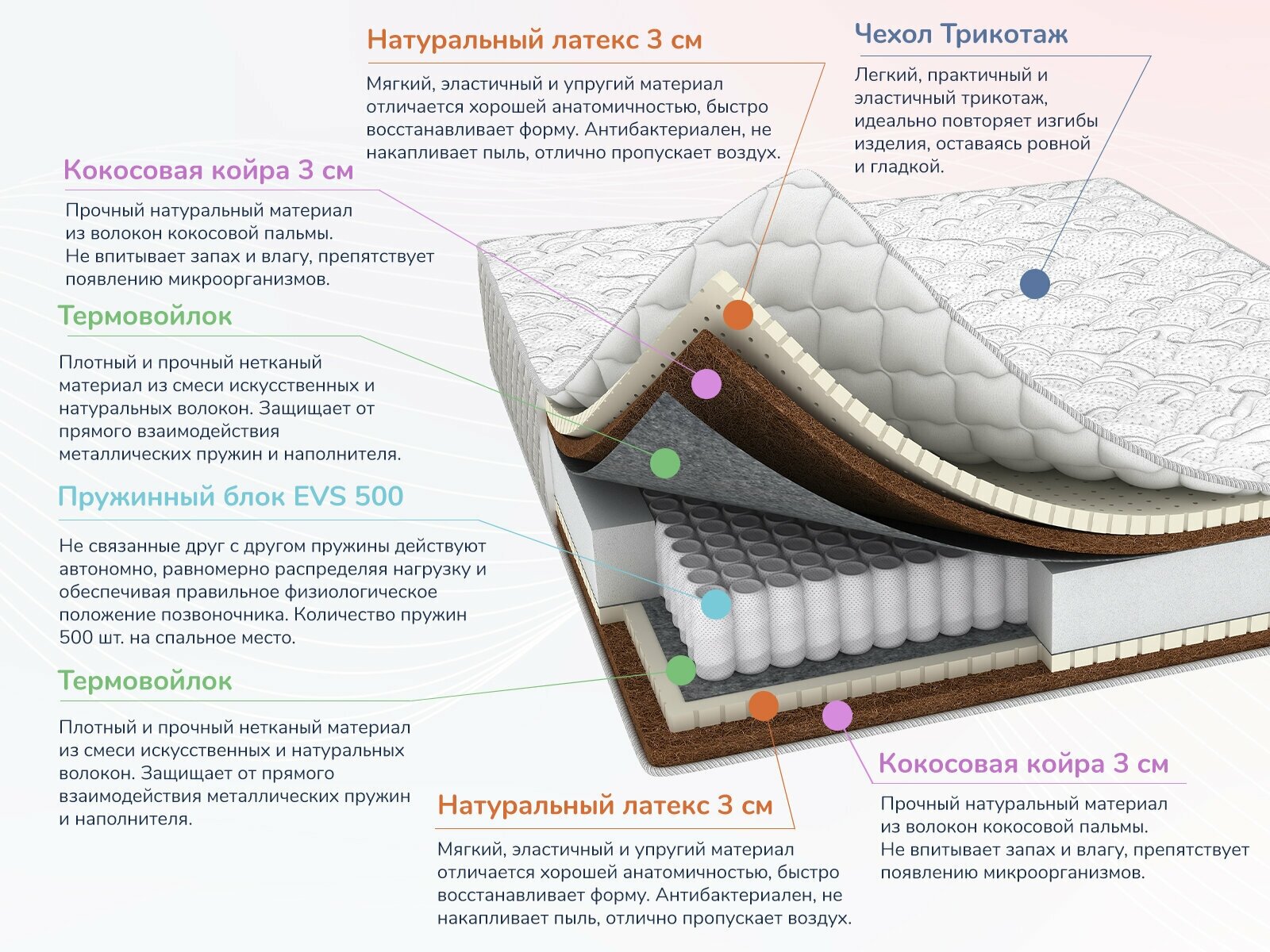 Лучшие цены. Пружины в матрасе ОК Ультимэйт выполнены из цилиндров и помещены в чехлы. Пружины обеспечивают ортопедичность за счет точечной подстройки. Блок бесшумный, долговечный, на нем не образуется эффект волны. Слои койры кокоса и перфорированного латекса чередуются друг за другом, создавая высокий матрас и разную жесткость по сторонам. Койра придает поверхности жесткость, ортопедичность и ровность. Латекс смягчает действие койры и придает матрасу упругой мягкости. Оба материала безопасны и гигиеничны. Магазины в вашем городе.