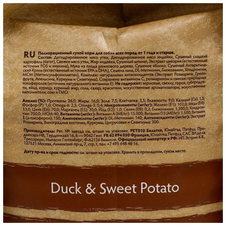 | Ингредиенты | утка 50%, батат 26%, горох, картофель 8%, свекла, апельсин, клюква / витамины, минералы / |
