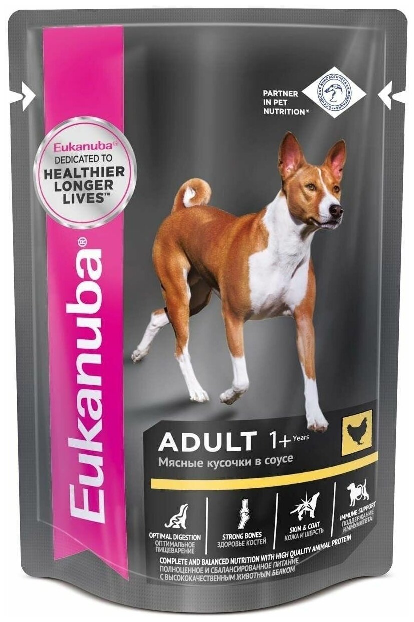 Лучшие цены. Влажный корм для взрослых собак всех пород Eukanuba Adult All Breed Lamb ягнёнок в соусе (пауч). Полноценное и сбалансированное питание для взрослых собак всех пород в возрасте старше 1 года с высококачественным животным белком. оптимальное пищеварение Способствует поддержанию здоровой кишечной микрофлоры за счет пребиотиков и клетчатки. здоровье костей Содержит кальций и другие важные минералы, необходимые для поддержания здоровья костей. Магазины в вашем городе.