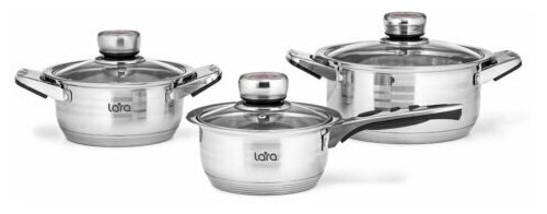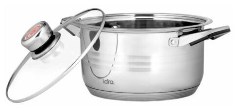 Лучшие цены. Технологичный набор кастрюль LARA серии “ADAGIO” с сотейником оснащён специальными термодатчиками для контроля температуры приготовления. Зеркальная полировка корпуса с тремя матовыми полосами будут прекрасно гармонировать с интерьером. Внутренняя мерная шкала для соблюдения рецептуры. Кастрюли выполнены из высокоуглеродистой нержавеющей стали AISI201 с комбинированной полировкой. Крышки изготовлены из термостойкого стекла с паровыпускному и стальным ободом С-формы, плотно прилегающим к стенкам. Магазины в вашем городе.