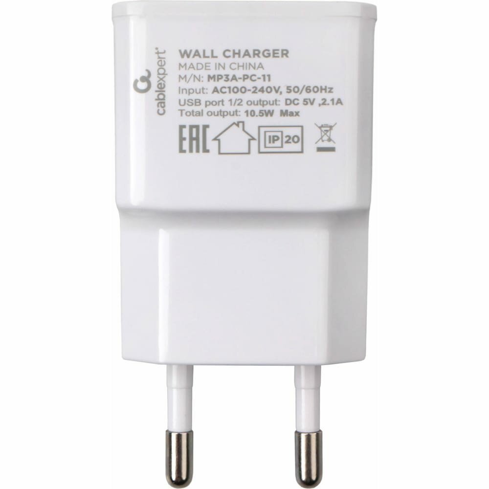 Сетевой адаптер питания Cablexpert MP3A-PC-11 зарядка 2.1A 2 USB-порта, белый