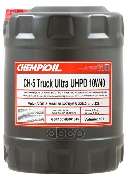 Лучшие цены. CHEMPIOIL CH-5 TRUCK Ultra UHPD 10W-40 9105 Инновационное всесезонное полусинтетическое (esters + HC-synthes) моторное масло для современных высоконагруженных и высокооборотистых дизельных двигателей с турбоннаддувом и без, работающих в тяжелых условиях. Масло соответствует Глобальной мировой спецификации GLOBAL-DHD-1, которая учитывает все требования европейских, американских и японских производителей тяжелых дизельных двигателей, произведенными начиная с 1998 года, работающих в тяжелых условиях с. Магазины в вашем городе.