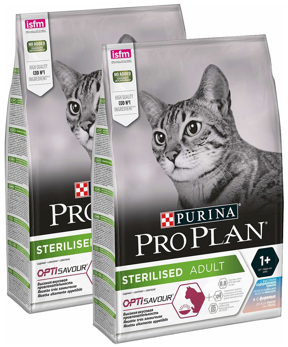 Сухой корм для стерилизованных кошек и кастрированных котов Purina Pro Plan Sterilised ADULT OPTISAVOUR, с треской и c форелью, 2 шт. х 1.5 кг