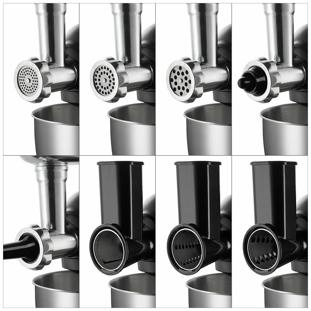 | Аксессуары | венчик для взбивания, насадка / крюк для замеса теста, лопатка для перемешивания (биттер), 3 диска для фарша, насадка для кеббе, насадка для домашних колбас, 3 насадки для нарезки/шинковки |