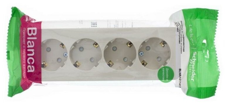 Лучшие цены. Розетка Schneider Electric BLANCA (открытой установки, цвет бежевый) четырёхместная с заземлением и шторками, с изолирующей пластиной подходит для сетей 250 В, на ток 16 А. - Заземляющий контакт обеспечивает дополнительную защиту от удара электрическим током. При наличии заземления электрический потенциал уходит в землю, защищая человека. - Входные отверстия расположены под углом 45 градусов, благодаря чему можно подключить несколько устройств: вилки и адаптеры не будут мешать друг другу. Магазины в вашем городе.