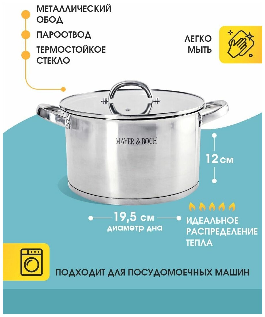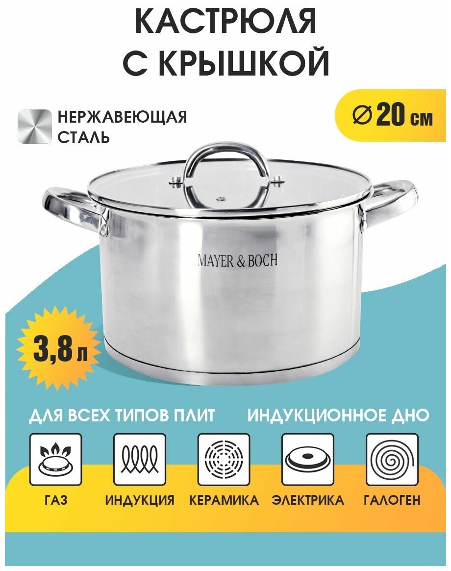 Лучшие цены. Кастрюля с крышкой МВ (х8). Материал: нержавеющая сталь. Дно: индукционное. Ручки: нержавеющая сталь. Крышка: стекло, нержавеющая сталь. Диаметр: 20 см. Объем: 3,8 л. Размер коробки: 25 х 22 х 15 см. Вес брутто: 1,500 кг. Упаковка: коробка. Страна-изготовитель: Китай. Кастрюля с крышкой MAYER&BOCH выполнен из высококачественной нержавеющей стали с многослойным термоаккумулирующим дном, способствующим высокой теплопроводности и равномерному распределению тепла. Магазины в вашем городе.