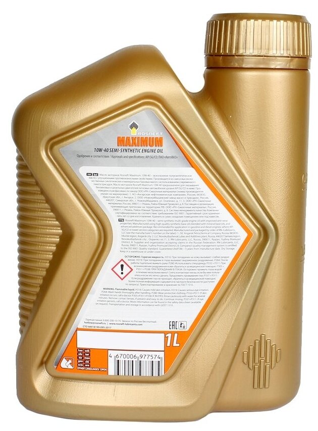 Лучшие цены. Спецификации: API SL/CF; ПАО «АвтоВАЗ»; ААИ Б5 СТО 003 Роснефть Maximum 10W-40 – всесезонное моторное масло эксплуатационного уровня API SL/CF. Производится на полусинтетической основе с использованием современного пакета присадок, обеспечивающих высочайшие эксплуатационные свойства. Отличные вязкостно-температурные характеристики масла обеспечивают легкий запуск двигателя при температурах до -25 С. Магазины в вашем городе.