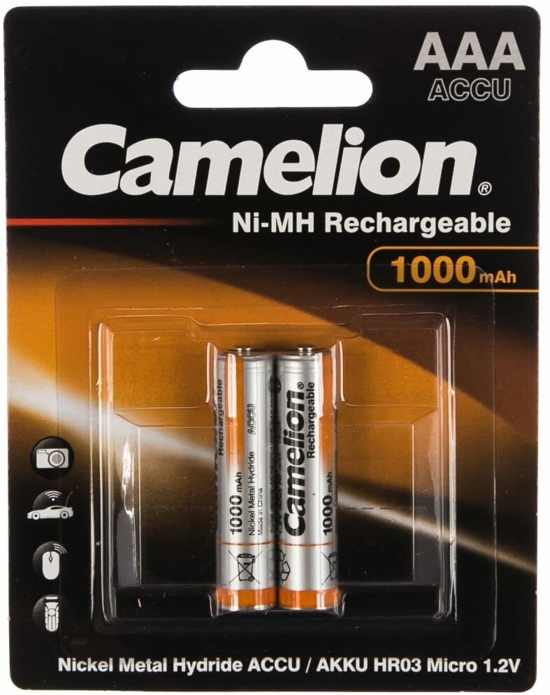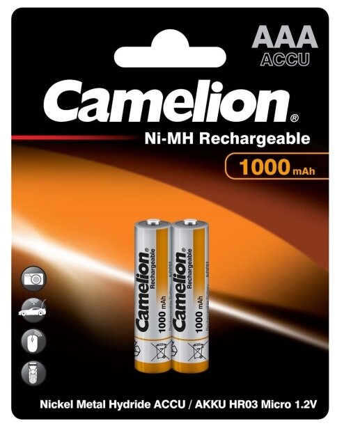 Аккумуляторы и батарейки Camelion AAA-1000mAh Ni-Mh BL-2 NH-AAA1000BP2, аккумулятор,1.2В 2 шт. в уп-ке