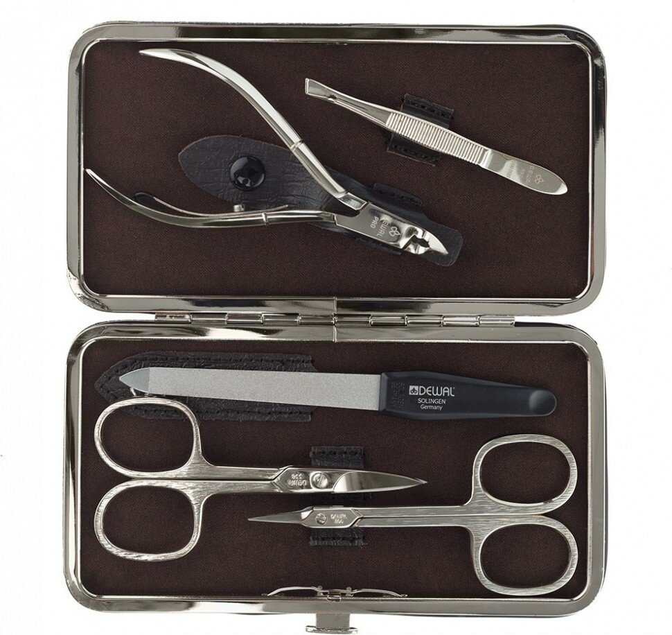 Лучшие цены. Маникюрный набор Dewal 903BROWN с комплектацией из 5 инструментов.Футляр: высококачественная натуральная кожа в коричневом цвете.Комплектация: ножницы для кутикулы - углеродистая сталь, никелированное покрытие, 9 см ножницы для ногтей - углеродистая сталь, никелированное покрытие, 9 см кусачки для кутикулы - нержавеющая сталь, никелированное покрытие, 10,5 см пилка металлическая - углеродистая сталь, хромированное покрытие, 12,5 см пинцет скошенный - нержавеющая сталь, никелированное покрытие, 8 см На. Магазины в вашем городе.