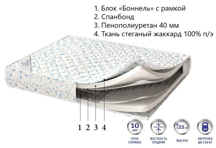 Лучшие цены. Пружинный матрас для кровати размером 110х186 см или 1100х1860 мм. Высокий матрас Milano Corretto на классическом пружинном блоке Боннель с усилением по периметру жесткой рамкой. С обоих сторон матраса присутствует пенополиуретан высотой 40 мм. Он позволяет спящему человеку испытывать непередаваемые ощущения комфорта и удобства во время сна. Матрас является лучшим среди недорогих и качественных матрасов Corretto за счет своей высоты и используемых материалов. Магазины в вашем городе.