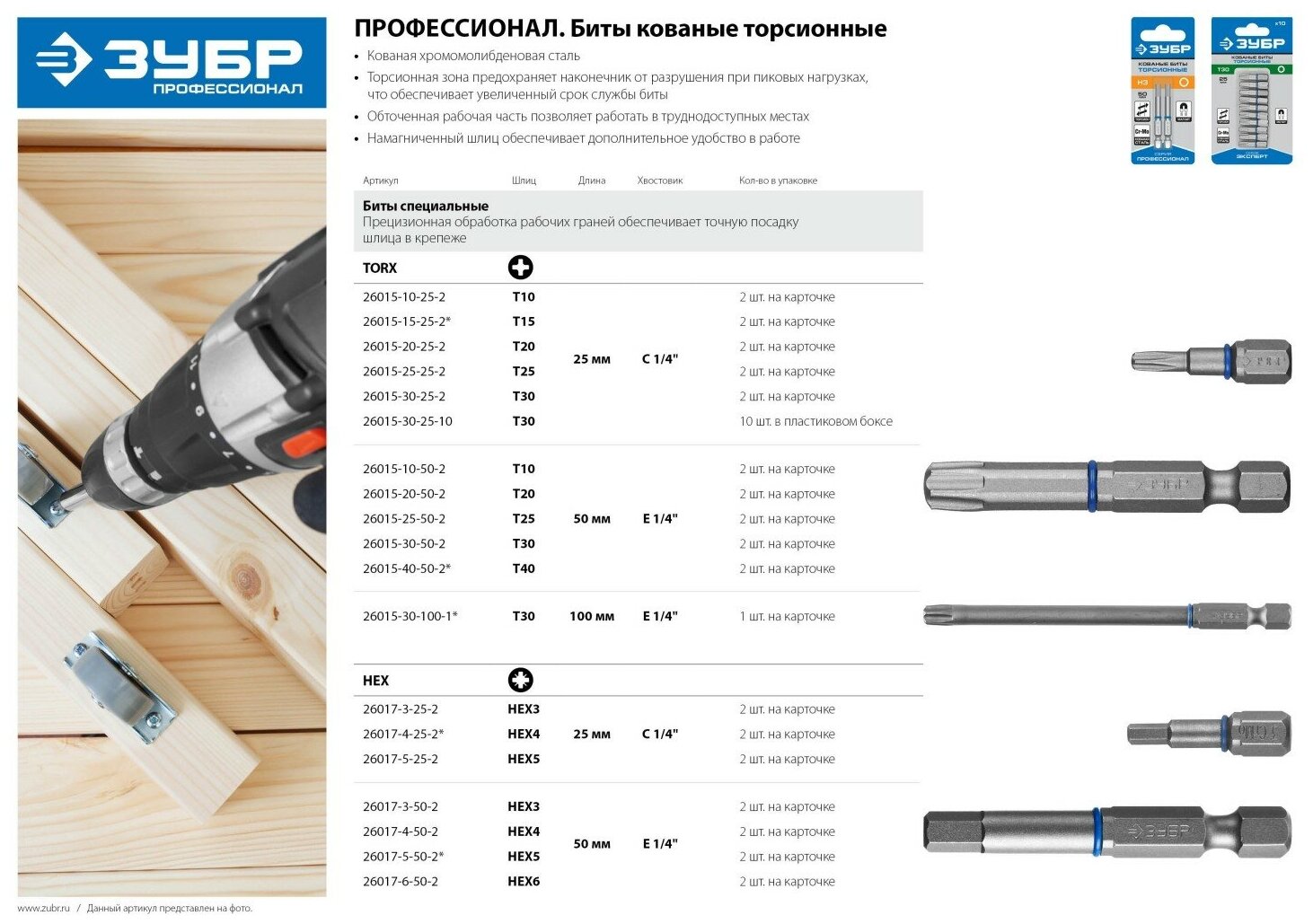 Биты ЗУБР эксперт торсионные кованые, обточенные, хромомолибденовая сталь, тип хвостовика C 1/4, T25, 25мм, 2шт