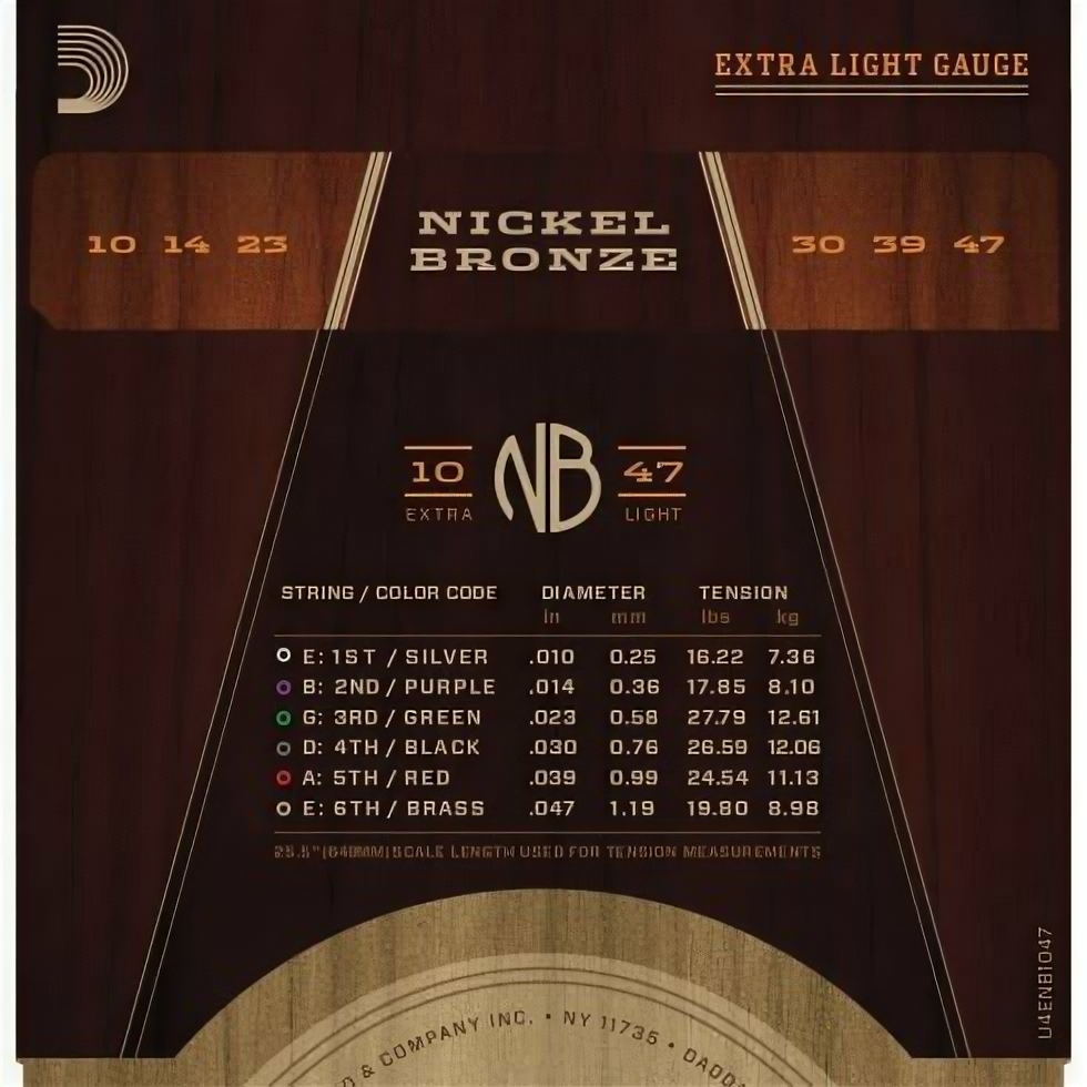 Струны D'Addario NB1047 Nickel Bronze Acoustic, Extra Light, 10-47 струны для акустической гитары