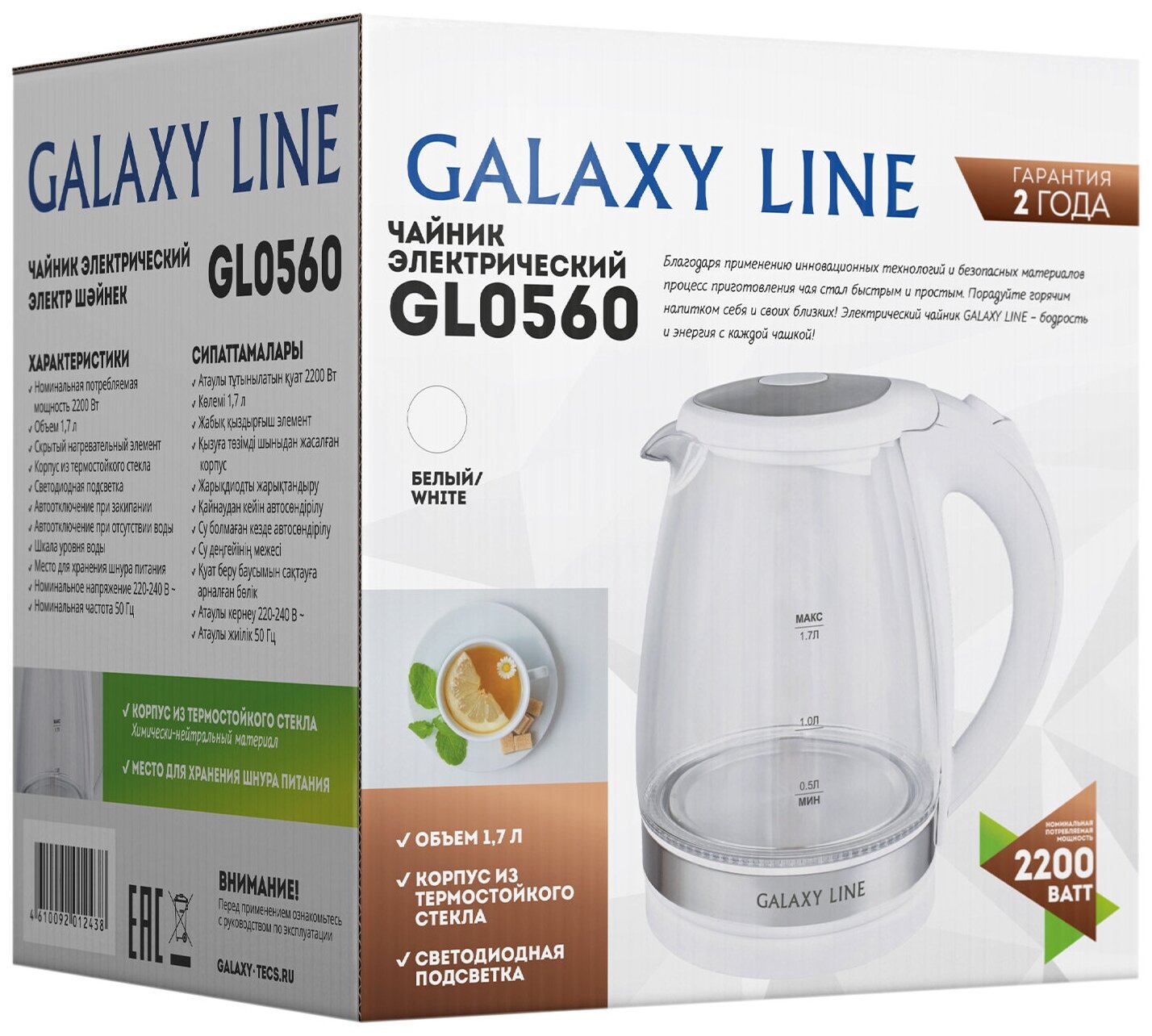 Лучшие цены. Чайник электрический GALAXY LINE GL0560 имеет элегантный современный дизайн, корпус из термостойкого стекла и светодиодную подсветку. Стекло является химически нейтральным материалом, поэтому чайник не меняет вкус и запах воды, экологически безопасен. Скрытый нагревательный элемент и высококачественный контроллер обеспечивают долгий срок службы чайника. Термостойкое закаленное стекло устойчиво к трещинам и сколам. Магазины в вашем городе.