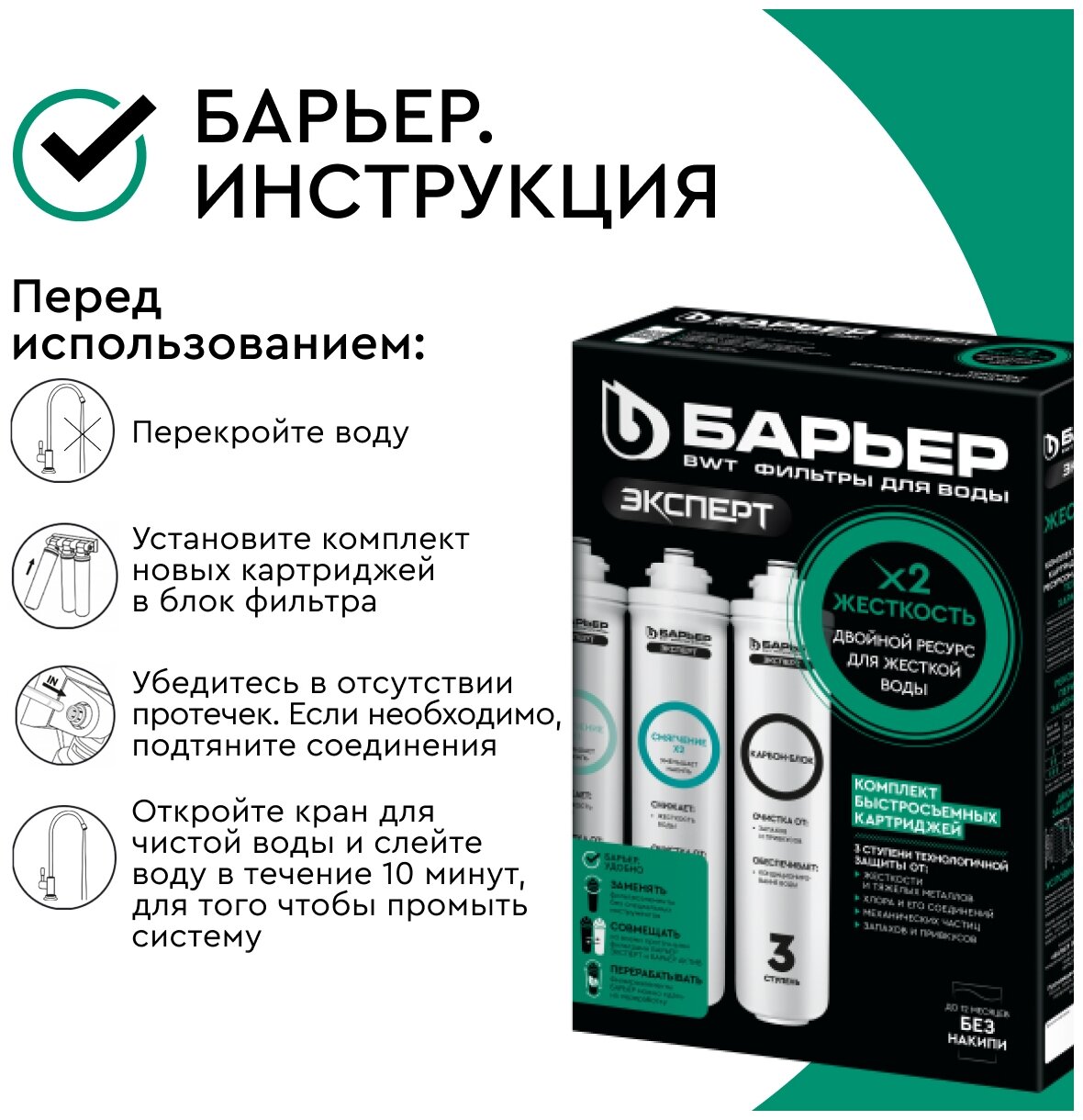 БАРЬЕР эксперт Жесткость х2, комплект картриджей для фильтра под мойку, двойная защита от накипи, быстросъемные