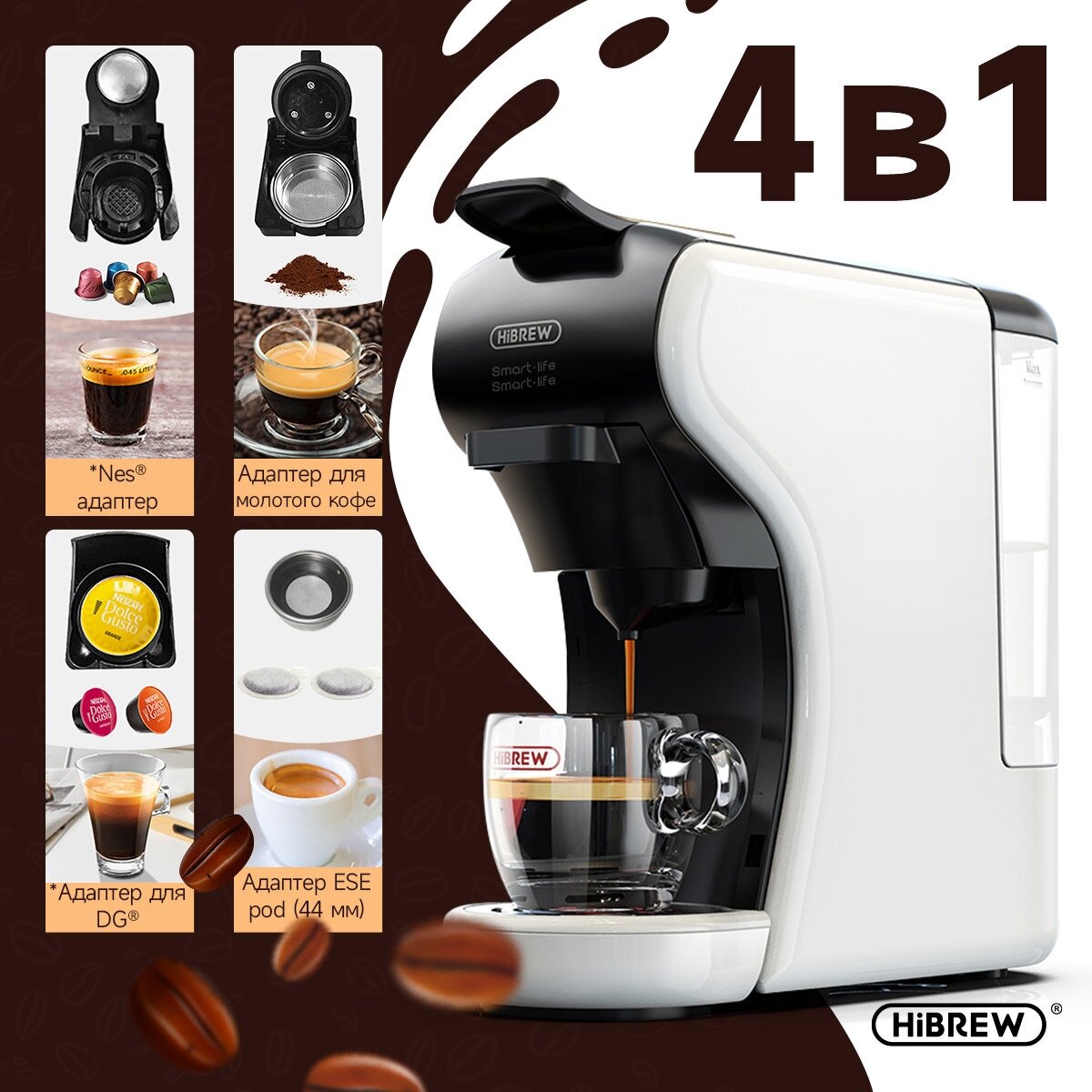 Капсульная кофемашина, Hibrew (ST-504)H1A Белый(ЕАС-сертификат) совместимый Капсулы Nespresso /Капсулы Dolce Gusto/Капсулы Starbucks/Свежемолотый кофе