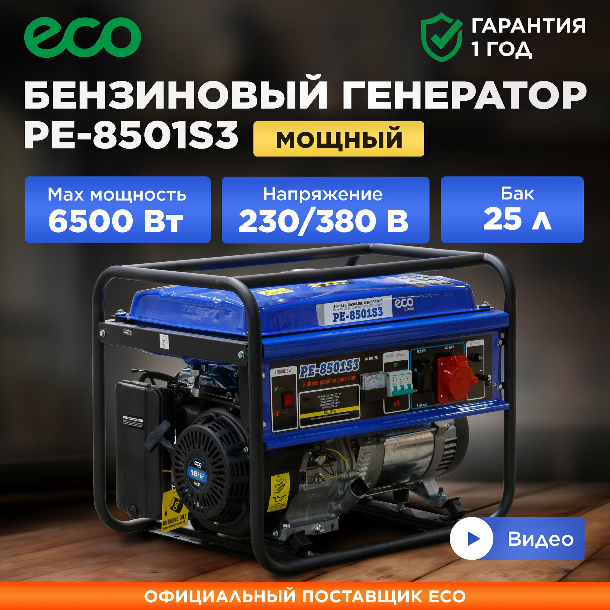 Генератор бензиновый ECO (6500 Вт, 15 л.с, 3-х фазный, (PE-8501S3))