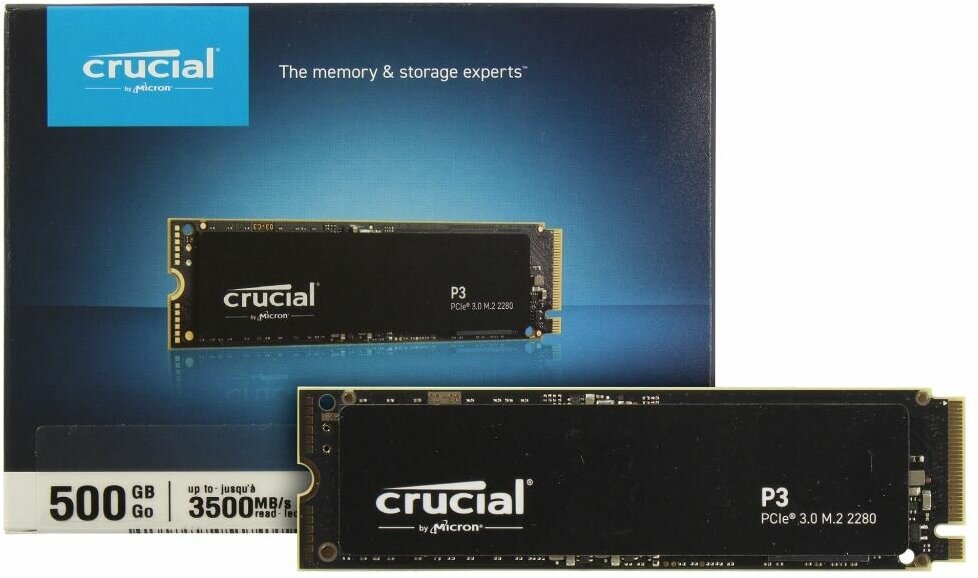 Твердотельный накопитель SSD Crucial P3, 500GB, M.2(22x80mm), NVMe, PCIe 3.0 x4, QLC, R/W 3500/1900MB/s, IOPs н.д./н.д., TBW 110, DWPD 0.1 (12 мес.)