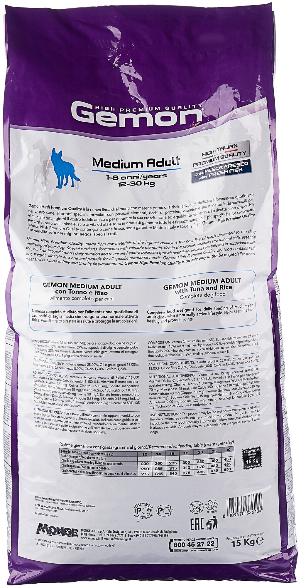 GEMON DOG ADULT MEDIUM для взрослых собак средних пород с тунцом и рисом (15 + 15 кг)