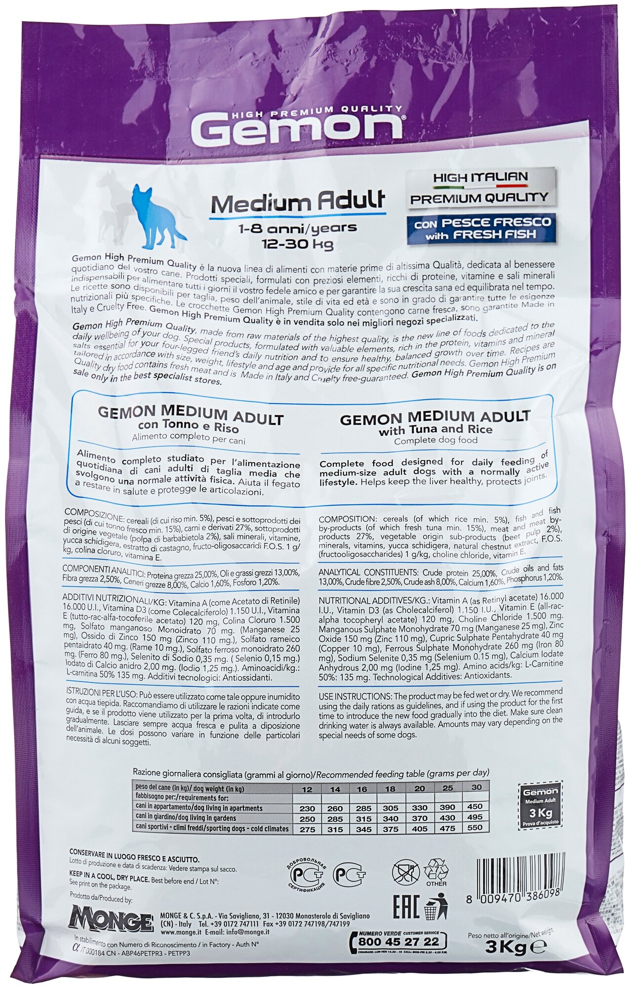 Лучшие цены. Сухой корм Gemon с тунцом и рисом (Джемон) Dog для взрослых собак средних пород в упаковке 3 кг. Полнорационный корм специально разработан для взрослых собак средних пород (12-30 кг) от 1 года. Сбалансированный рацион содержит фруктоолигосахариды (ФОС) и свекольную пульпу, которые регулируют баланс кишечной бактериальной флоры и обеспечивают правильную работу пищеварительной системы. В составе корма содержится свежая рыба для повышения вкусовой привлекательности. Магазины в вашем городе.