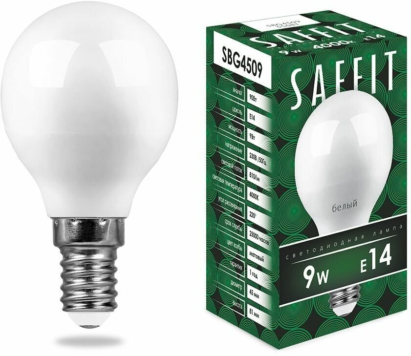 Лампочка Лампа светодиодная SAFFIT SBG4509 Шарик E14 9W 4000K