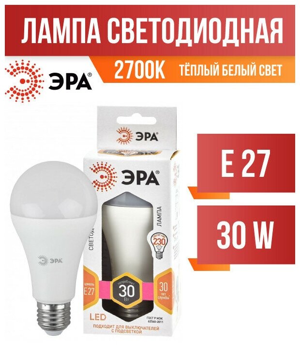 ЭРА LED A65-30W-827-E27 ЭРА (диод, груша, 30Вт, тепл, E27) (10/100/1200)