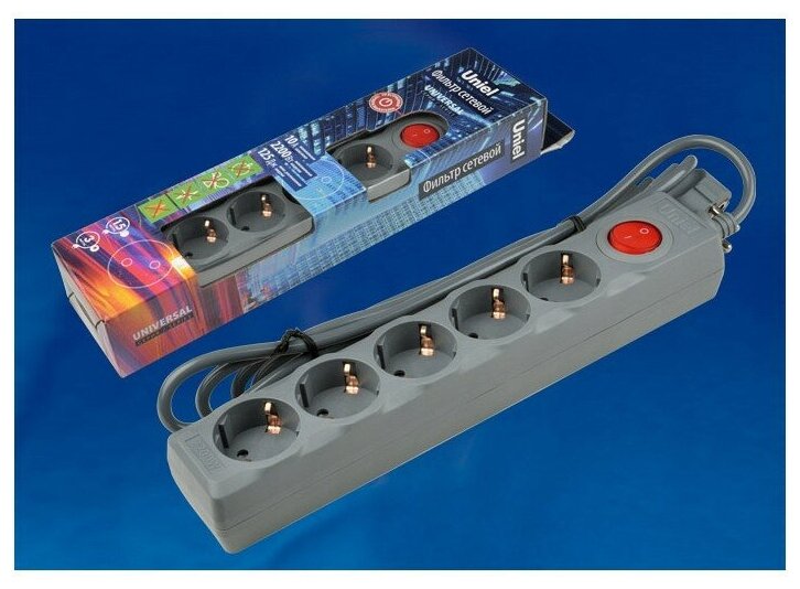 Сетевые фильтры и удлинители Типы/Электротовары/Удлинители и сетевые фильтры Uniel Сетевой фильтр Uniel 5гн х 3м с/з Universal S-GSU5-3 Grey UL-00001746