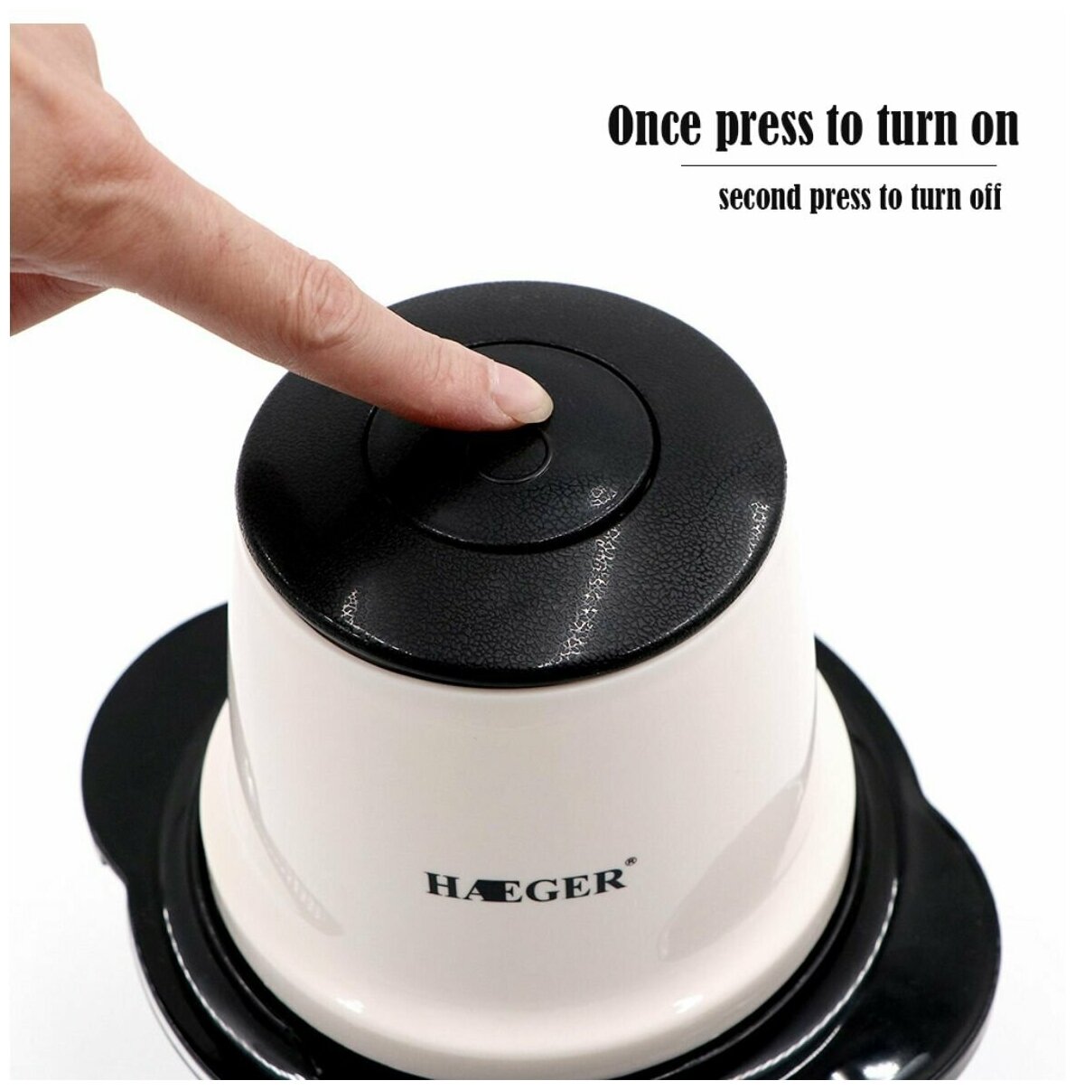 Лучшие цены. Измельчитель HAEGER - электрический измельчитель, который пригодится на любой кухне. Удобная модель поможет измельчить самые разные продукты – от твердого сыра и овощей до сырого мяса. Чаша объёмом 2 литра, сделана из прочного АВС пластик. Измельчитель имеет 1 скорость вращения . HAEGER не займет много места на вашей кухне, но сэкономит массу времени на готовке, он сможет заменить мясорубку и блендер. Особенности: мощность 250W 3 лезвия из нержавеющей стали Длина шнура 67 см. Магазины в вашем городе.