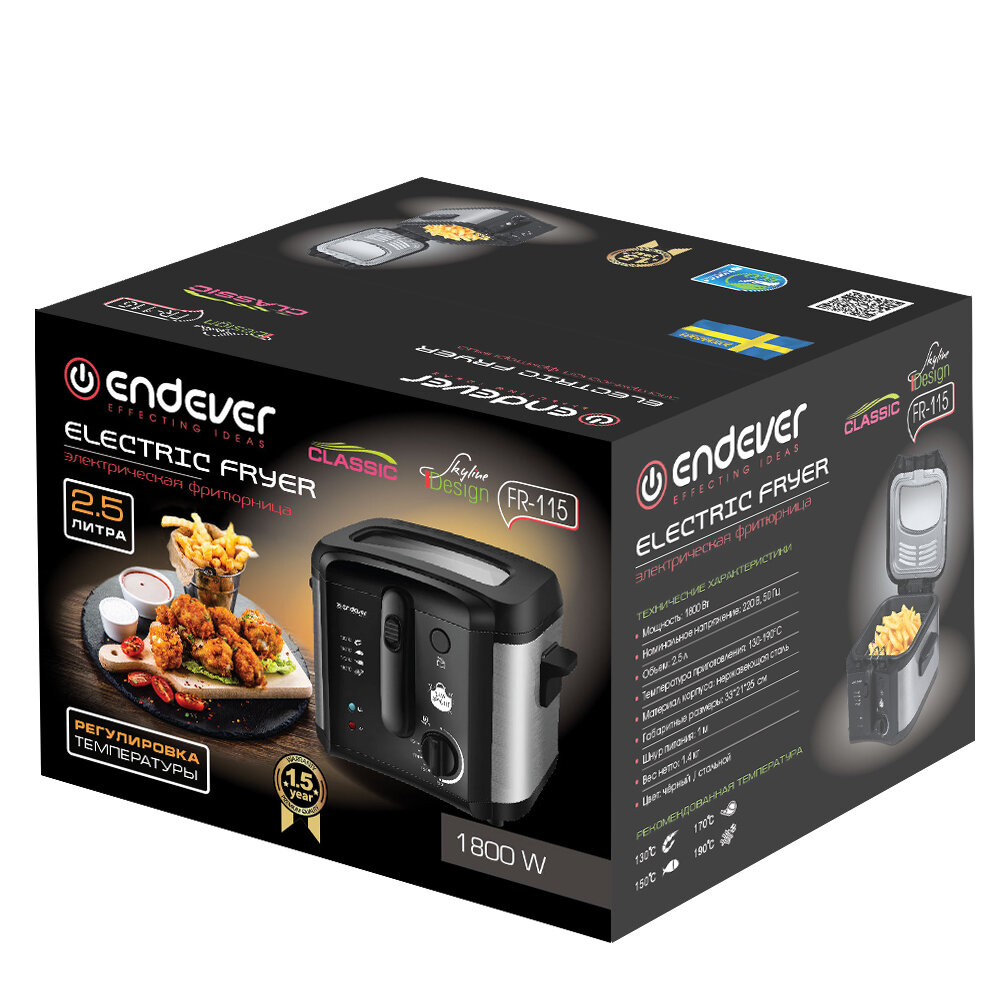 Лучшие цены. Фритюрница электрическая ENDEVER Skyline FR-115 Наши инженеры и дизайнеры придерживались элементарных принципов: форма следует за функцией, разумное использование ресурсов, простоты и эффективности. Удобная в использовании, компактная электрическая фритюрница ENDEVER Skyline FR-115 нацелена на максимально быстрый прогрев и старт. Вам больше не придется платить за прогрев пустого внутреннего пространства. Максимально возможная среди фритюрниц такого класса мощность в 1800 вт Вас обрадует. Магазины в вашем городе.
