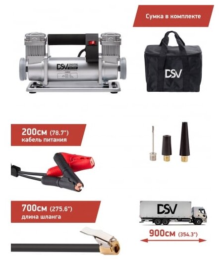 Лучшие цены. Компрессор для шин DSV HEAVY 228000 - экстрамощное устройство с максимальной производительностью 160л/мин. Данная модель автомобильного двухцилиндрового компрессора поставляется в заводской упаковке, имеет ряд очевидных преимуществ: быстросъемный воздушный шланг 700см с манометром, реле контроля напряжения, прорезиненные коннекторы к АКБ, застежка-велкро для удобства хранения провода, мягкая ручка-держатель, два воздушных фильтра, защищающие компрессор от чрезмерного износа в условиях запыленности. Магазины в вашем городе.