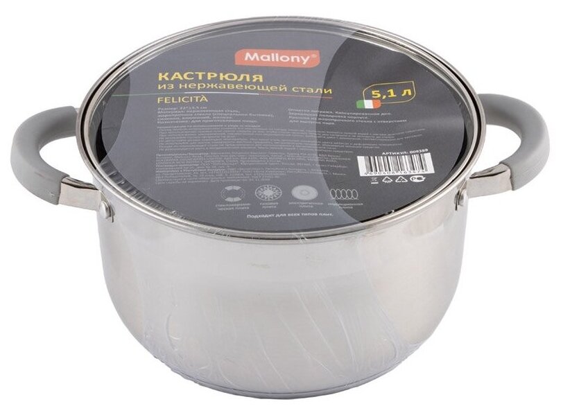 Кастрюли Mallony Кастрюля Felicita, объем 5,1 л, из нерж стали с крышкой из жаропрочного стекла, размер 22*13 .