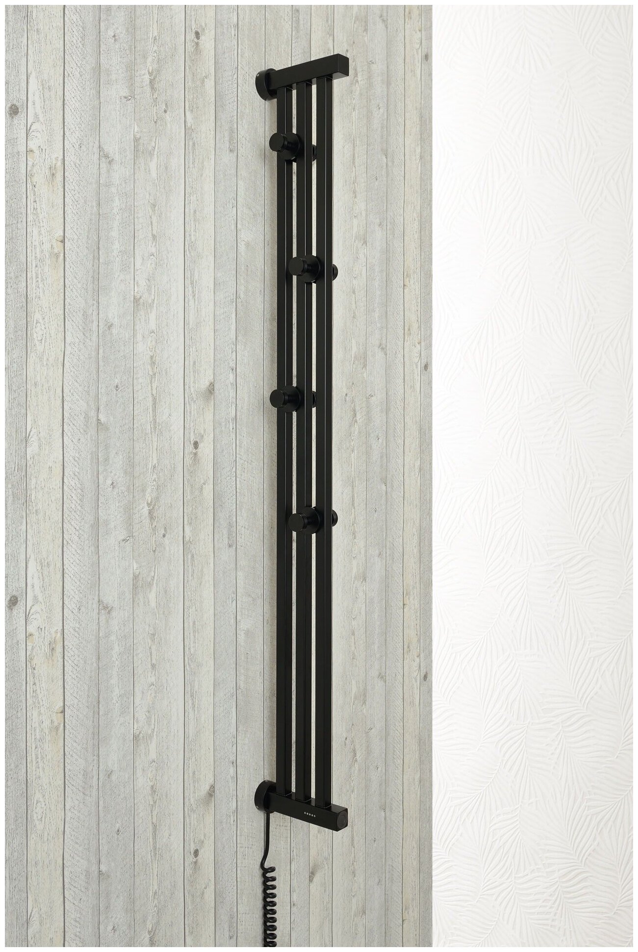 Лучшие цены. Цвет: черный, Форма: I-образная, Материал: нержавеющая сталь, Ширина, см: 9.8, Высота, см: 125, Глубина, см: 16.6, Длина, см: 16.6, Монтаж: подвесной, Подключение: скрытое электрическое соединение, электропровод с вилкой, Мощность, Вт: 65, Напряжение, В: 230, Время нагрева, мин: 30, Макс. температура теплоносителя, C: 60, Теплоноситель: сухой, Поворотный: нет, Автоотключение при нагреве: есть, Электровыключатель: есть, Терморегулятор: есть, Дополнительные функции: Электровыключатель, Терморегулятор. Магазины в вашем городе.