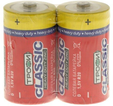 Лучшие цены. Батарейка солевая Трофи CLASSIC HEAVY DUTY Zinc, D, R20-2S, 1.5В, спайка, 2 шт. -Вес: 142 г. -Фасовка: 1 шт -Тип индивидуальной упаковки: Полиэтиленовая пленка -Длина упаковки: 6.5 -Высота упаковки: 3 -Ширина упаковки: 6 -Объем упаковки: 0.117 -Объем продукта: 0.1663 -Объем бокса: 16.625 -Материал: См. Магазины в вашем городе.