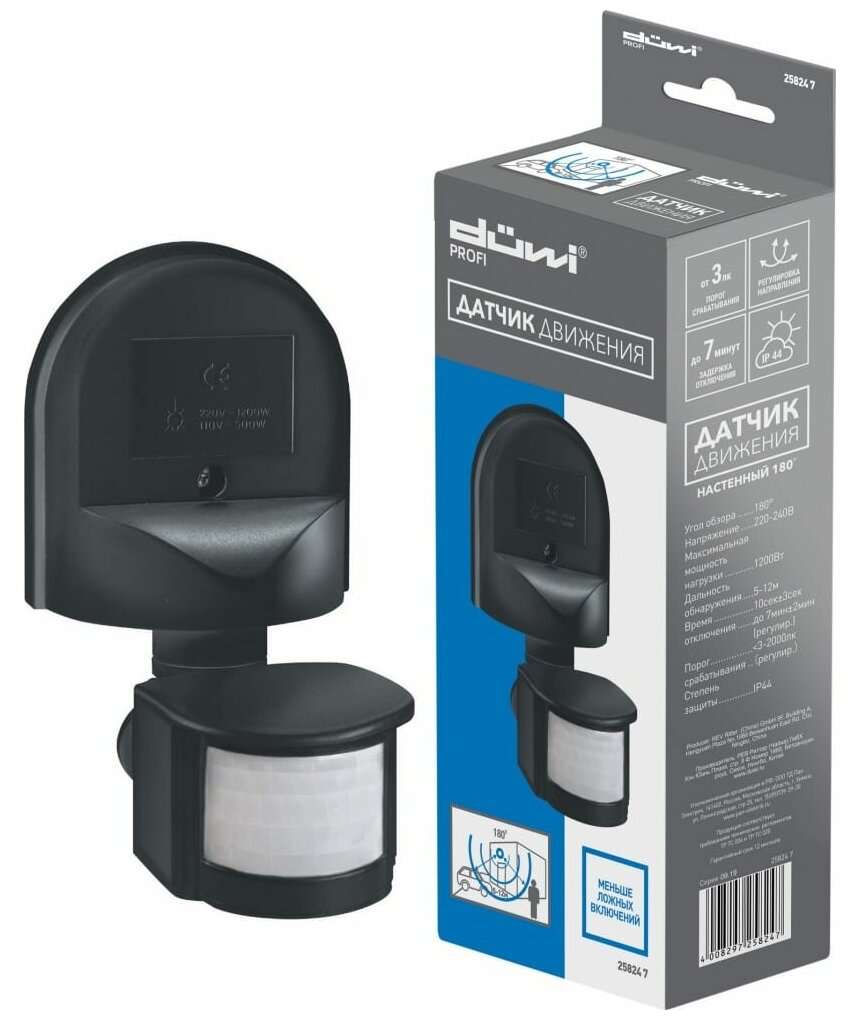 duwi Датчик движения dхwi DD-01, 180°, 1200Вт, 10-420 с, 5-12 м, 2500Лк, IP44 , настенный, черный