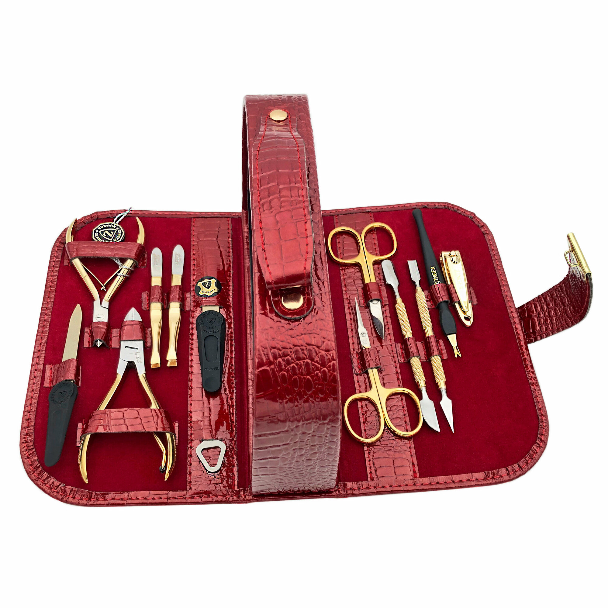 Маникюрный набор Zinger MS-1101-BG, позолоченный/темно-красный крокодил, 12 предметов