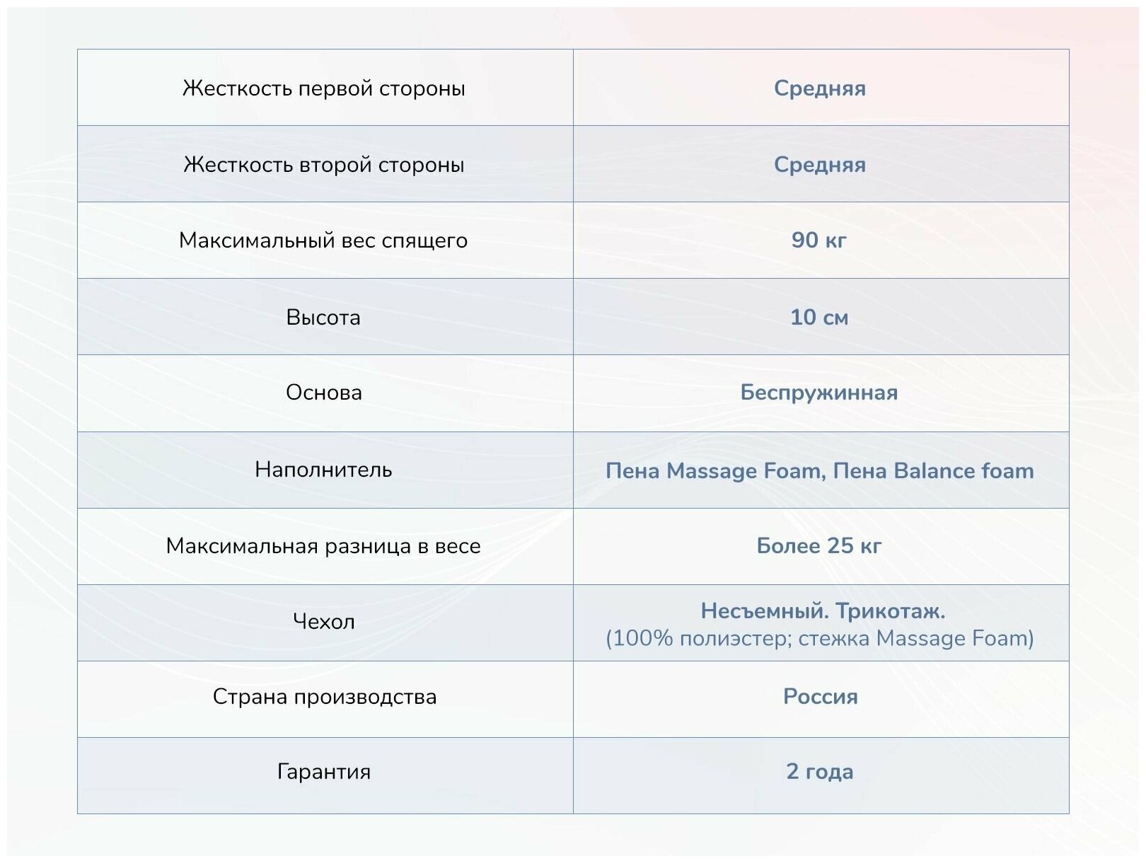 | Жесткость | низкая / ниже средней (1/2), двусторонний |